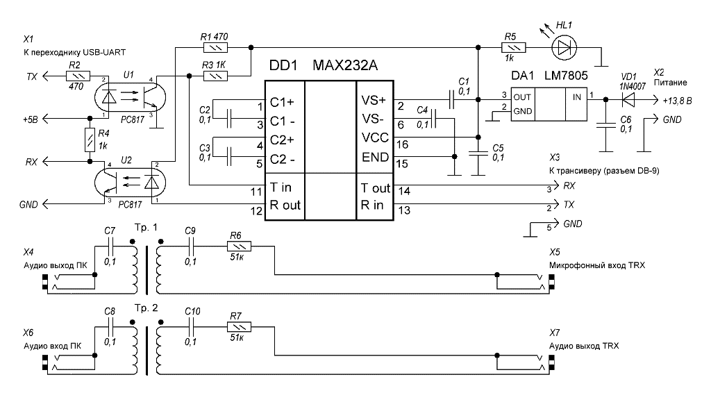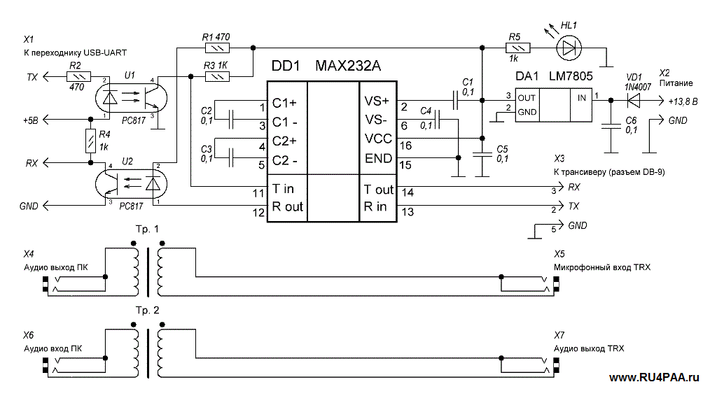 интерфейса выполняется при помощи оптопар, а звуковых цепей - через